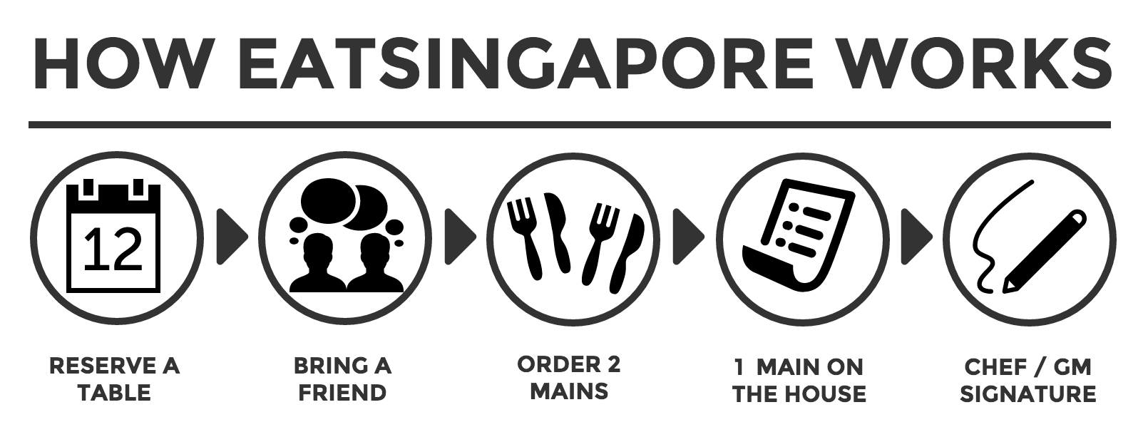 EATSingapore is a restaurant recommendation guide, featuring 12 hand-picked restaurants which are published in a yearly book. When you visit these restaurants with your book and a friend, you'll get the second main course for free. You can do this once at all 12 restaurants that we have featured in our book.