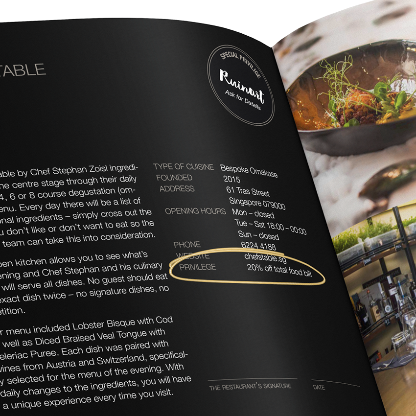 The idea of EATSingapore is that you get the second main course for free at each featured restaurant. Certain restaurants only offer set menus, if this is the case, the specific privilege is highlighted on the restaurant page in your book. E.g. this can be 20% off the total food bill as you can see on the image below.